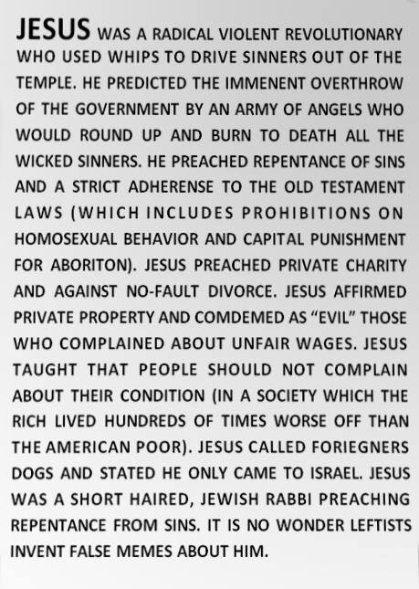 My wife tipped me off that the leftist were publishing a meme that falsely characterizes Jesus. People like to recreate Jesus in their own ideology. For example, if people support homosexuality and they like Jesus, then they will look for reasons to say a 1st century Jewish apocalyptic supported homosexuality. It is really mind boggling.