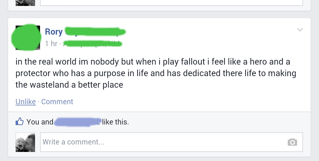 People might not realize that video games massively improve people’s standard of life. Video games, for some gamers, have untold mental resiliency benefits. See this anonymous player (Rory) on the video game franchise Fallout: