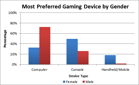 Notice the mobile gender discrepancy. So much for the dailydot article that thinks woman gaming stereotypes are inaccurate. It should be noted that this chart does not show the hour differential on the various devices, which might even further the woman-male divide on mobile devices and the consoles. This is also just showing preference, not total use.