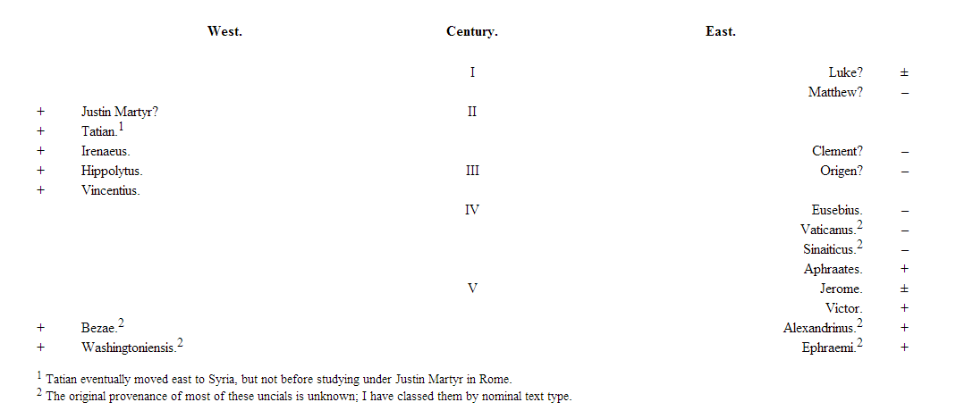 This brings us back to the reliability of Alexandrian texts. One website categorizes the opinions of the various Church Fathers on the endings of Mark. He, interestingly enough, categorizes the Church Fathers as East and West. The chart is telling: